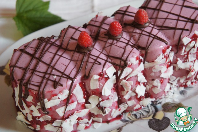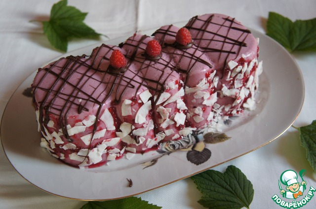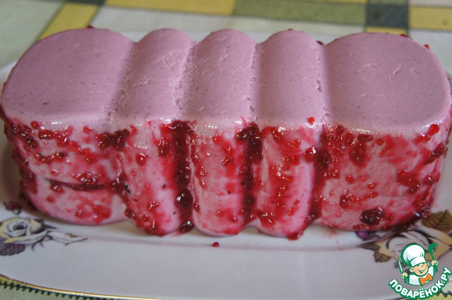 Когда масса хорошо застынет, вынуть террин из формы, бока промазать малиновым джемом,