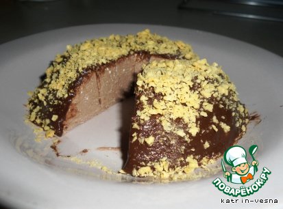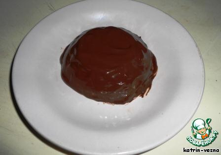 Когда шоколад мой остыл, я достала из морозилки свой будущий десерт, переложила его на блюдце (он хорошо внимается из посуды) и покрыла шоколадной смесью.