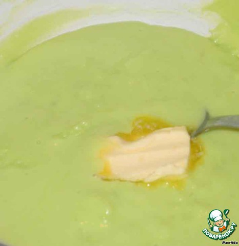 вилочкой или венчиком смешиваем до однородного состояния яйца (2 шт), муку (2ст.л.), сахар (2ст.л.), ванилин и йогурт (у меня питьевая Активиа с кусочками ананаса), я добавила немного зеленого пищевого красителя, чтобы получить красивый фисташковый цвет, ставим всю это смесь "на водяную баню" и готовим, помешивая, до загустения, снимаем с огня, добавляем сливочное масло и хорошо перемешиваем, можно взбить блендером, чтобы масса получилась нежнее и пышнее