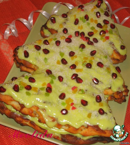и наслаждаемся творожной елочкой...вкус очень похож на сырники с курагой и черносливом, если хотите, чтобы коржи получились нежнее, то муки нужно взять меньшее...но мой пупсик обожает жевательные конфеты...а эти елочки получились именно такими :)