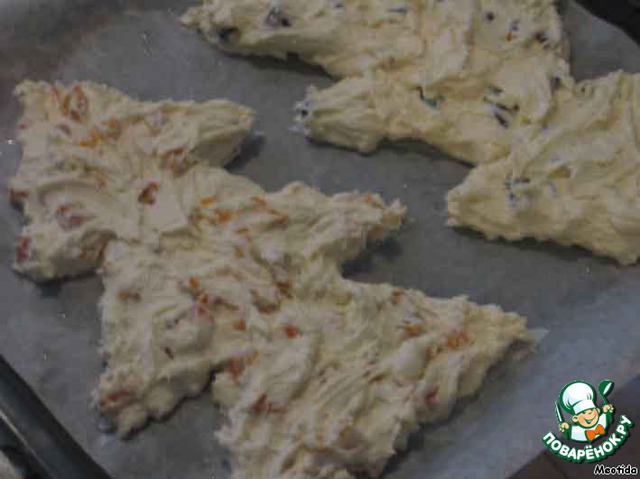 противень застилаем бумагой для выпекания, смазываем маслом, выкладываем в форме елочек творожную массу