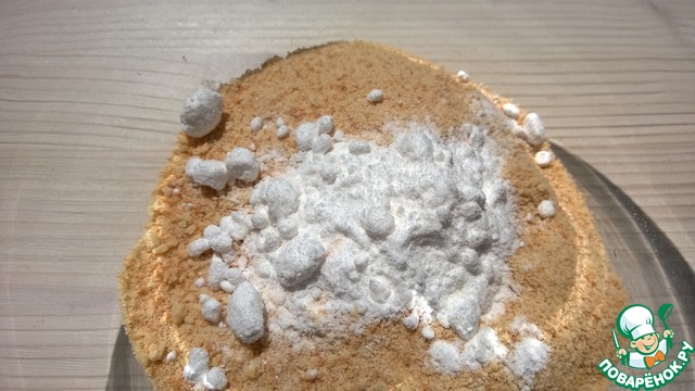В измельченное печенье добавьте сахарную пудру и растопленное сливочное масло. Перемешайте.