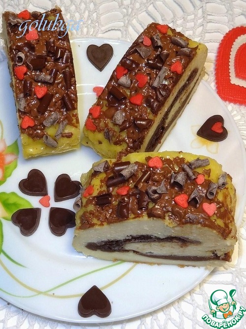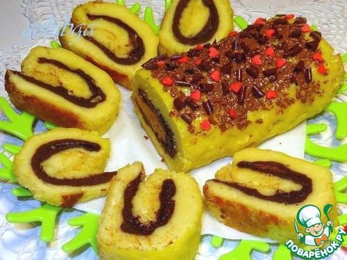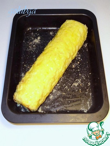 Рулет свёрнут. Затем я смазала рулет желтком и на 5 мин. поместила в духовку (t 190 гр), он приобрел желтоватый цвет. Затем кладем немного остывший рулет до полного остывания в холодильник.
