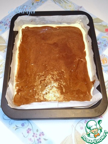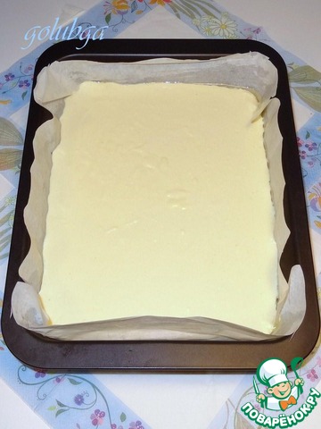 Форму для выпечки (у меня 25*30 см, берите больше размером, рулет будет красивее) выстлать кулинарной бумагой, которую слегка смазать растительным маслом. На бумагу равномерно выложить творожную массу.