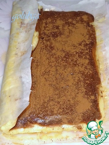 Присыпать сверху выпечку какао (2 ст. л.) и начать сворачивать сырник рулетом, помогая себе бумагой, на которой выпекался сырник. Бумага будет отходить от сырной массы хорошо и без проблем.