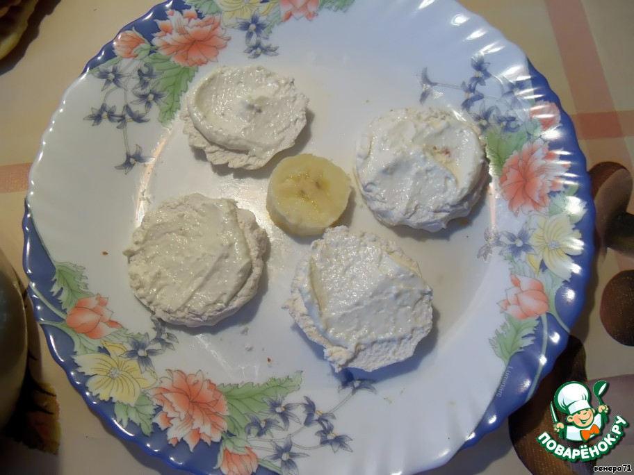 На дно тарелки выкладываем зефир и банан. Смазываем немного кремом.