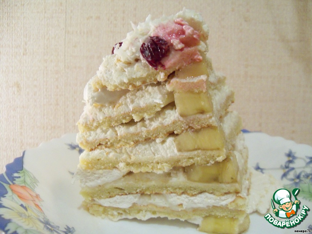 В банан вставить шпажку, на нее надеть вафлю, покрыть кремом, разложить зефир.