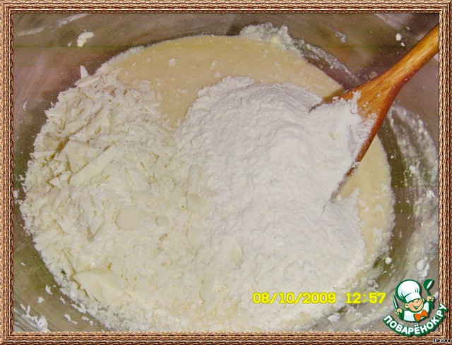 Добавить муку, разрыхлитель и тертый шоколад.Тщательно размешать.