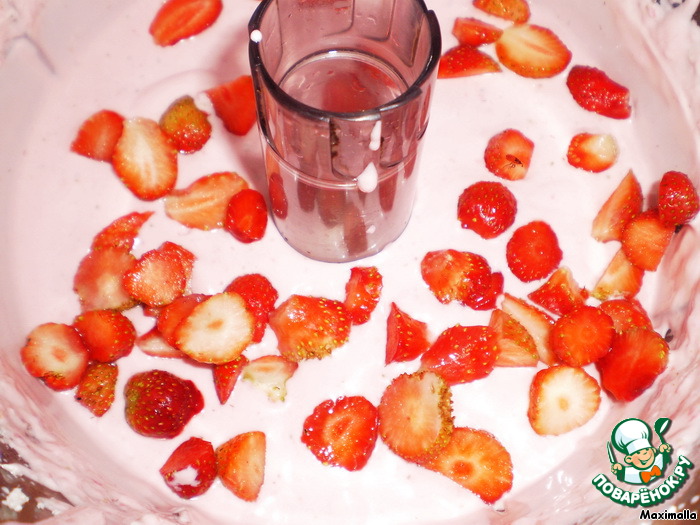 Оставшуюся клубничку порезать на половинки или четвертинки, в зависимости от размера, и перемешать с творожной массой. Это и будет наш крем.