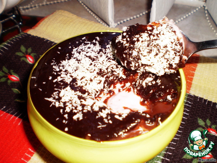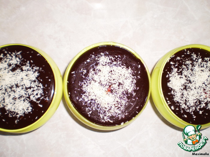 Залить теплой глазурью. Посыпать кокосовой стружкой. Охладить в холодильнике полчасика.
