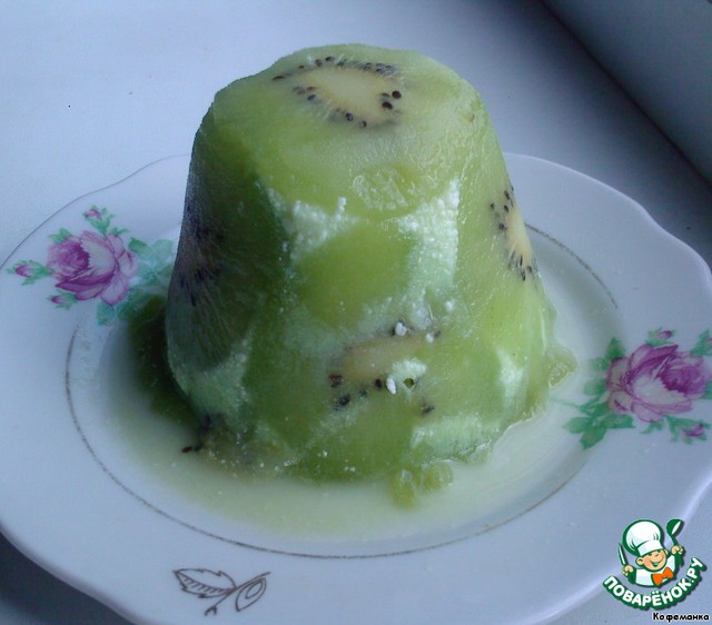 А вчера попробовала приготовить любимую творожную горку с киви. Получилось отлично! (если Вас, конечно, не смущает зелененький цвет десерта =-O ). Делала так же, как и в первом случае, только, естественно, использовала дольки киви и желе "Киви".