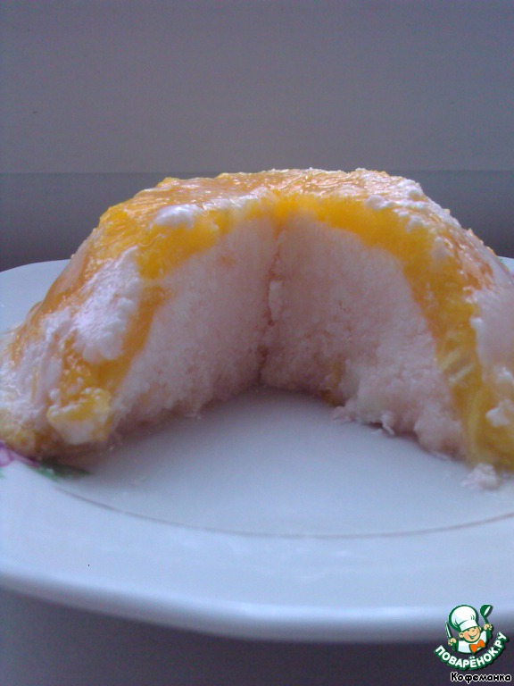 Небольшую пиалу выстелила тонкими кусочками апельсина, выложила творожную-желейную массу, поставила в холодильник для застывания. Затем достала, опрокинула на тарелку и получила вот такой десертик. Долго его в холодильнике лучше не держать, т.к. апельсин дает сок. Получился вкусный и ароматный десертик!