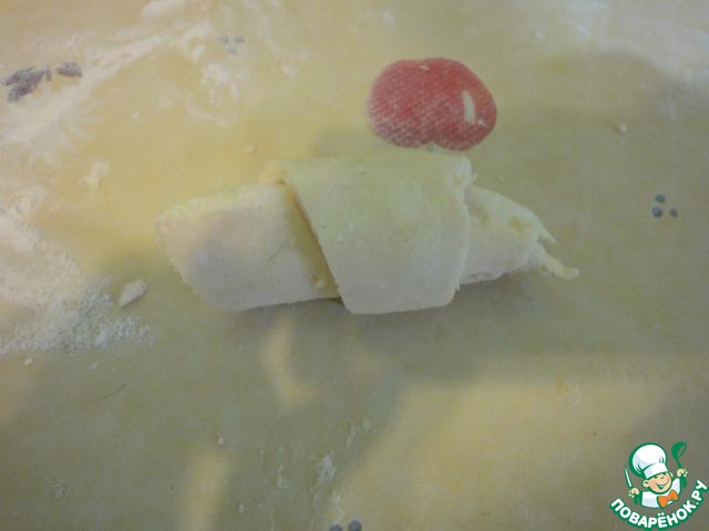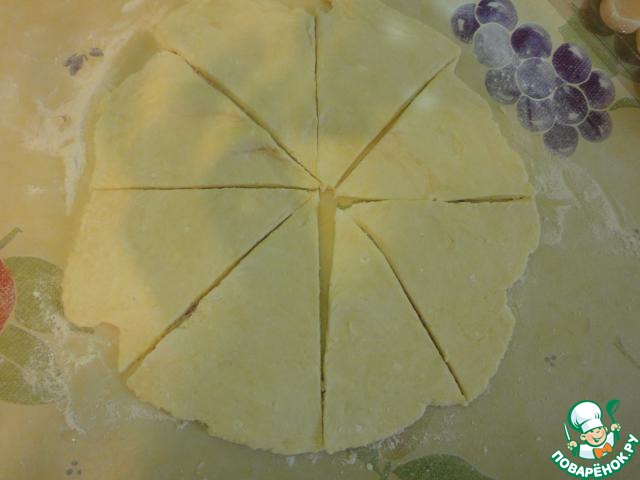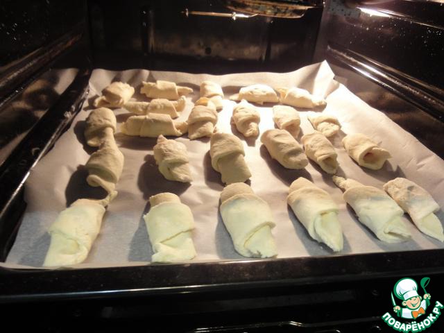 | По сути обычные творожные рогалики, только с начинкой. Обычно я в тесто кладу сметану вместо творога. Но сегодня сметаны не было, и я воспользовалась творогом :) Рецепт нравится мне тем, что в тесте совершенно нет ни сахара, ни яиц! Готовится очень быстро, а результат... ПРЕВОСХОДНЫЙ!) |
