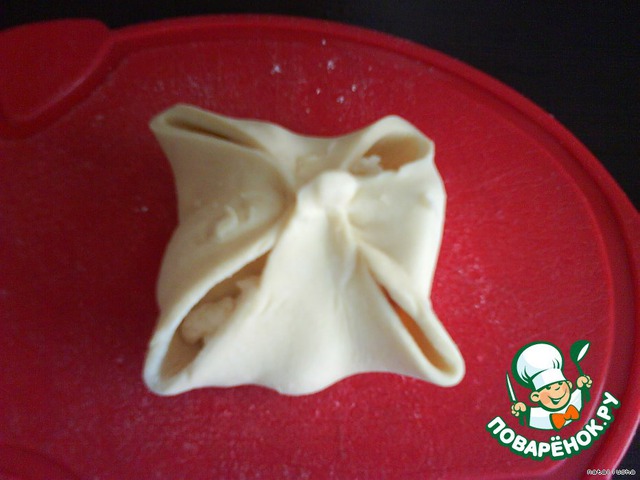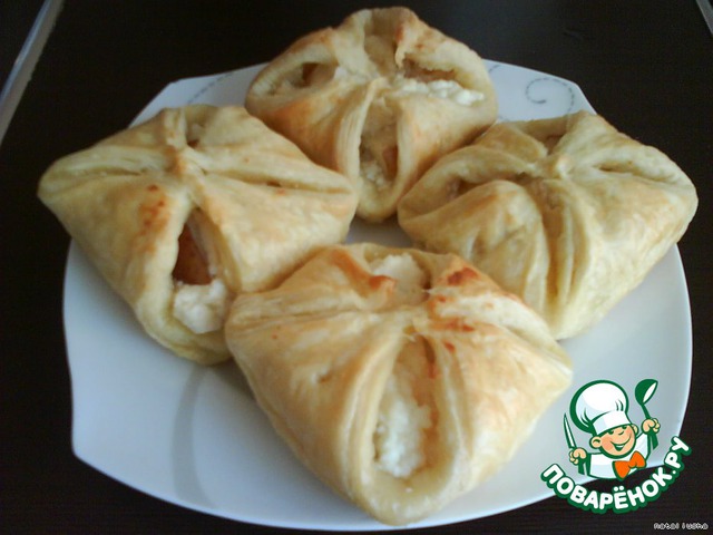 Раскатать тесто, порезать на квадратики. В серединку каждого квадратика положить творог и воткнуть 2-3 кусочка груши.