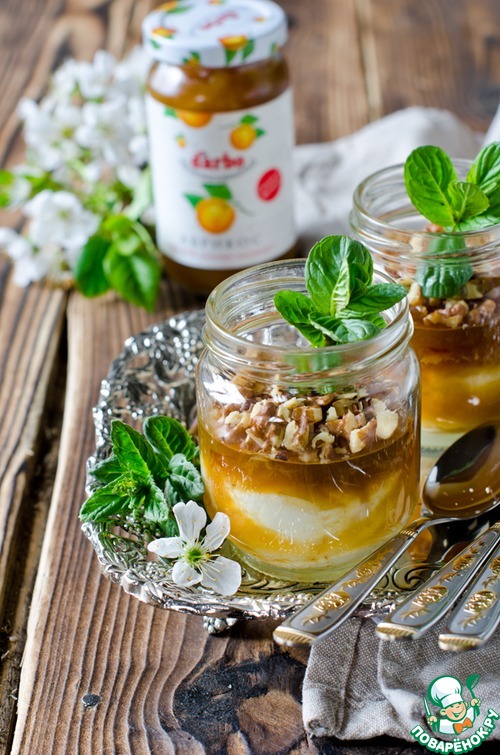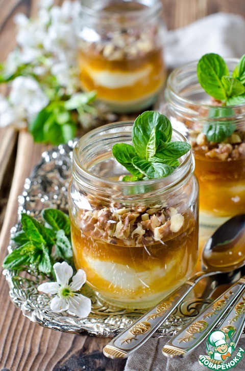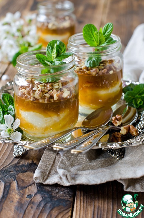 Дать желе немного остыть, а затем покрыть им запеканку. Дать застыть в холодильнике.