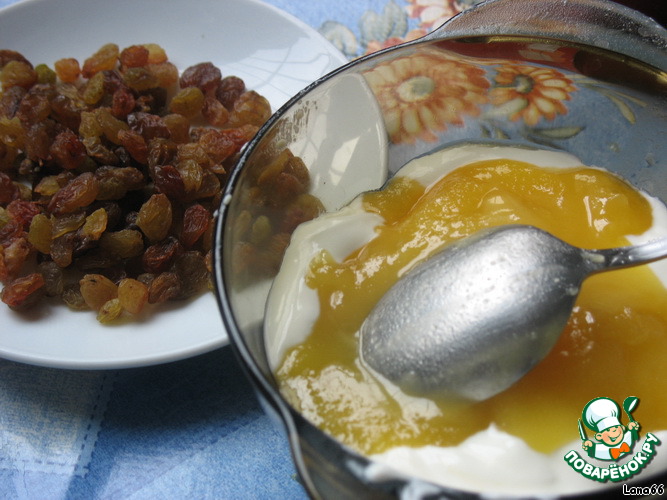Сметану смешать с медом изюмом.