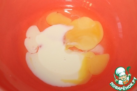 Тем временем готовим заливку, для этого смешиваем яйцо со сгущённым молоком, взбиваем. Для любителей по слаще можно сгущёнки побольше добавить.