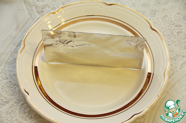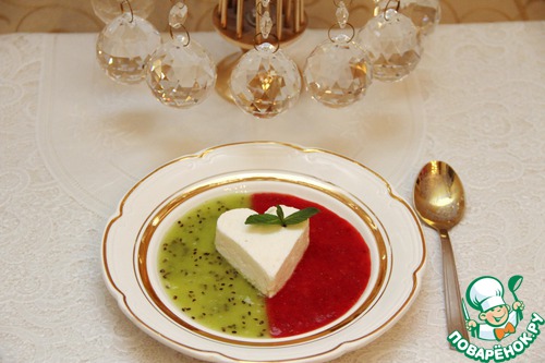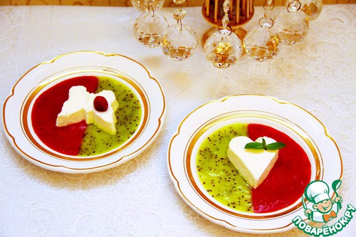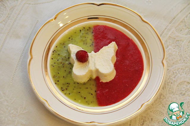 Возьмите лист картона, длина стороны которого равна диаметру дна тарелки. Оберните его фольгой. Поставьте картон на середину тарелки. На одну половину тарелки выложите 2 ст. л. пюре из киви и распределите по ней. Картон не поднимайте. То же самое сделайте со второй половиной тарелки, только с пюре из клубники. Осторожно уберите картон.