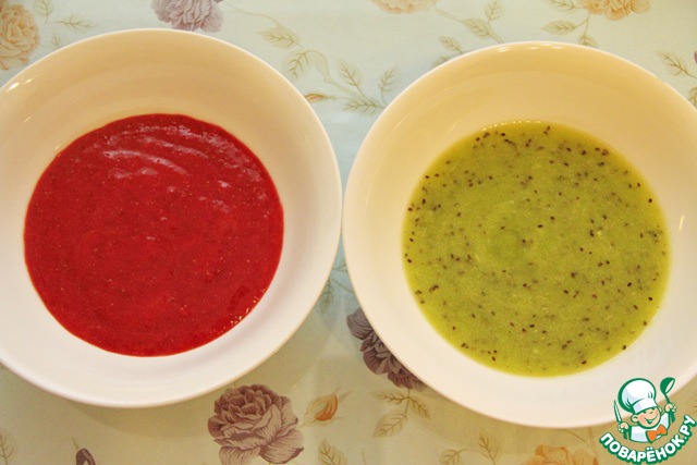 Для кули. Протрите через сито или измельчите блендером по отдельности плоды киви и клубнику. В каждый вид пюре по вкусу добавьте сахарную пудру.