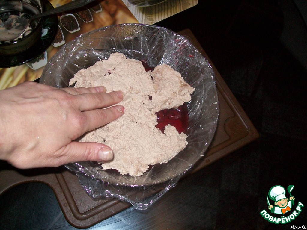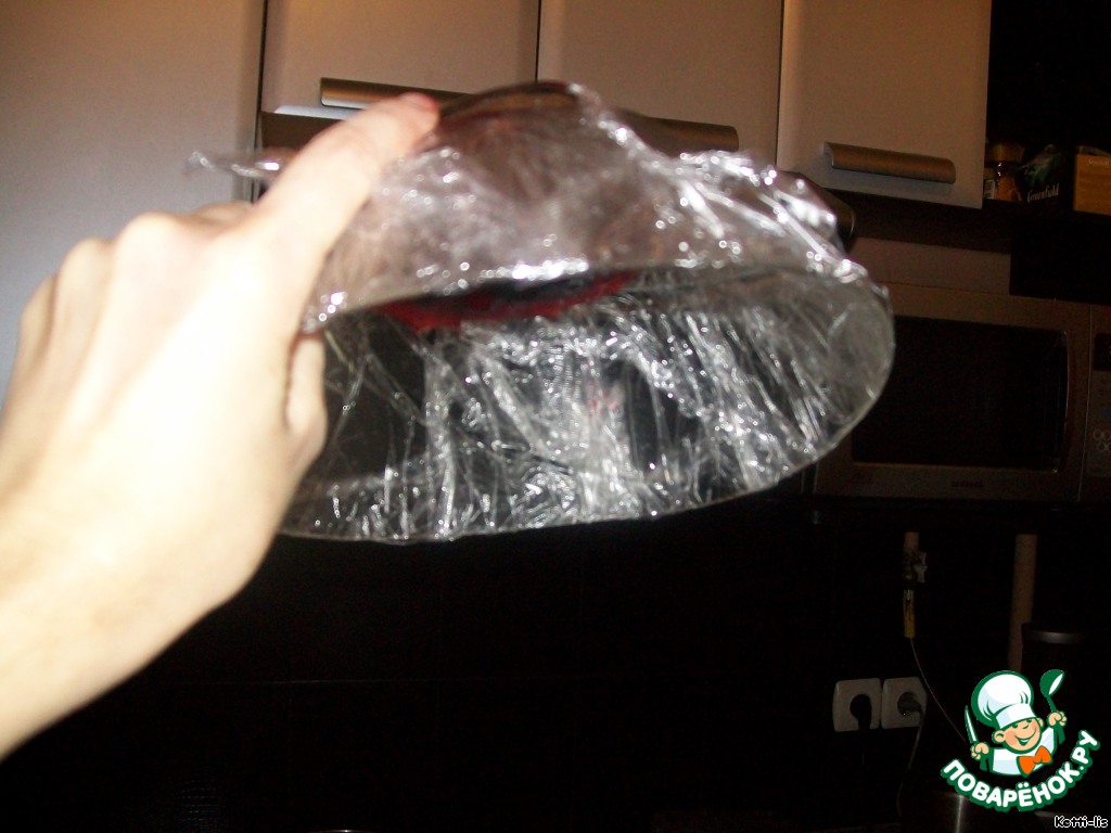 Взять подходящую посудину (у меня салатница) и застелить пленкой. На дно выкладываем немного вишни и заливаем половником заливки. Убираем в холодильник. Но хочу Вам сказать, что это застывает сразу. Вот на фотке демонстрирую.