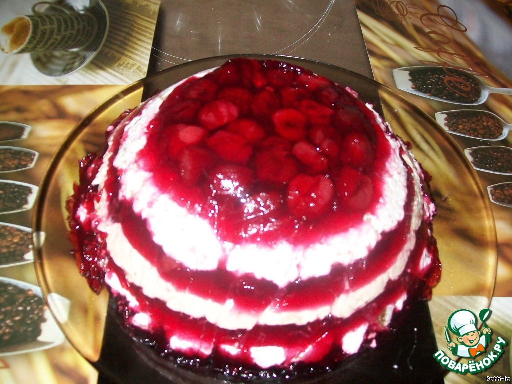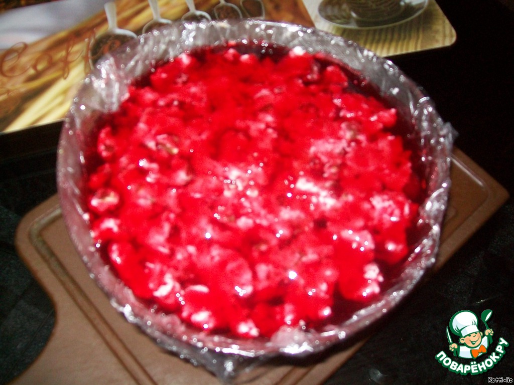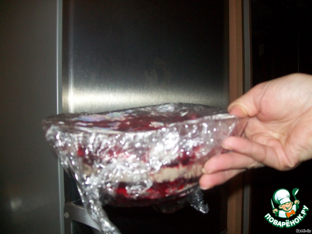 Ну и дальше в таком же духе выкладываем все остальные слои. Последний слой - просто заливка без вишни. Затянуть пленкой и убрать в холодильник на полчаса, чтобы, так сказать, блюдо устоялось. :)