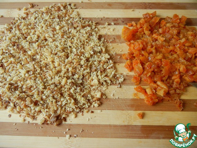 Курагу хорошенько промываем, заливаем кипятком и оставляем размокнуть в горячей воде на 15-30 минут. По прошествии времени воду с кураги сливаем, и промакиваем бумажной салфеткой или полотенцем. Нарезаем мелкими кубиками.