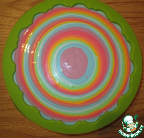 В форму выливаем по очереди строго по серединке по 2 ст. ложки каждого цвета