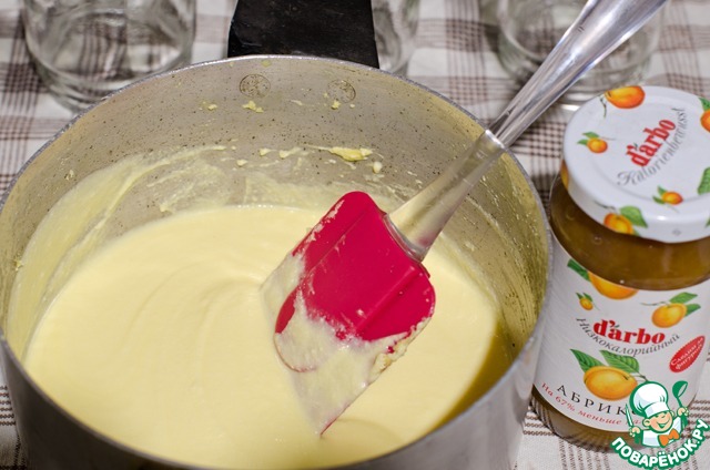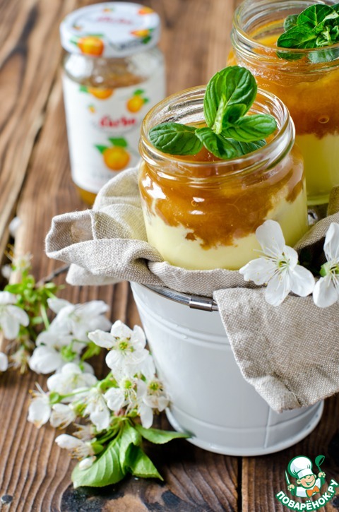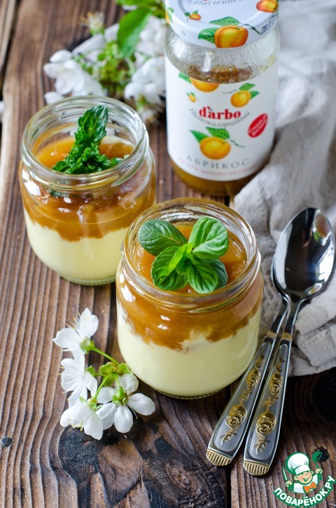 Отправить в холодильник на 1-2 часа. После того, как десерт охладится, добавить в баночки низкокалорийный конфитюр D’arbo - абрикос и подавать к столу. Приятного аппетита!!!