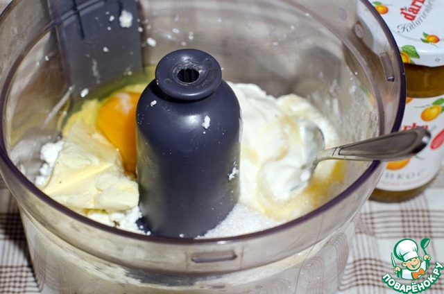 В чашу процессора поместить творог, сахар, сливочное масло, куриное яйцо, сметану и щепотку ванилина.