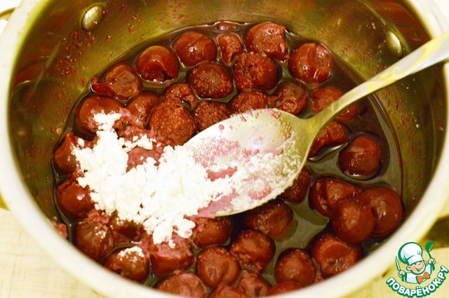 6. Для соуса в сотейнике смешать вишню, сахар, крахмал и воду. Довести до кипения и готовить на медленном огне, помешивая пару минут, пока соус загустеет. Остудить. Запеканку нарезать порционно и подать с соусом