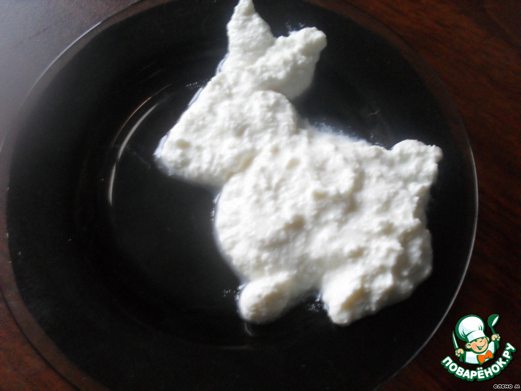 С помощью кондитерского мешка выкладываем десерт на блюдо, придавая форму зайчика.