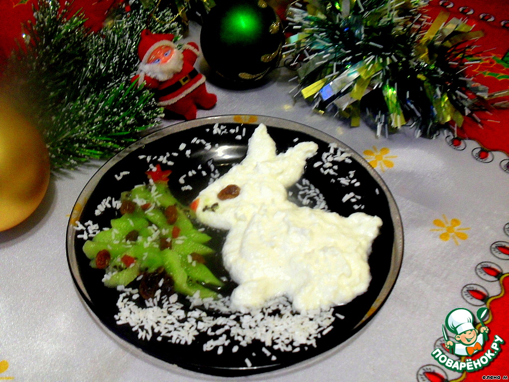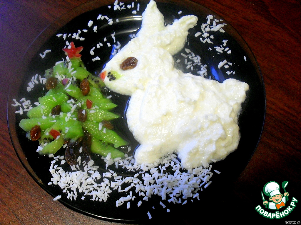 Глазки зайчонку делаем из изюма, носик из маленького кусочка яблока.