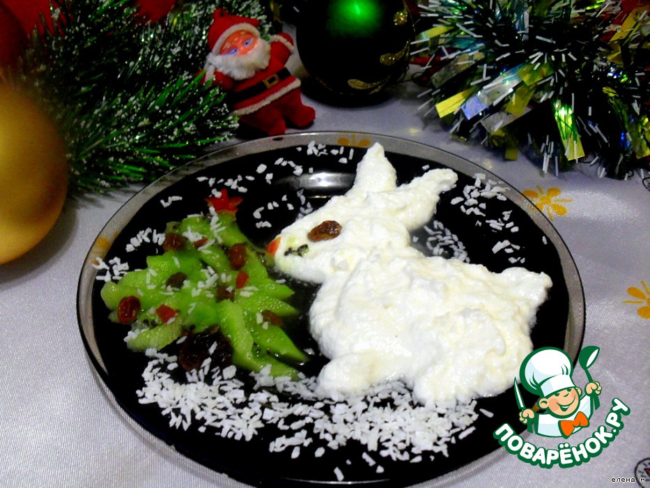 Из нарезанного киви выкладываем елочку, украшаем "шишками" из изюма и "елочными игрушками" из яблока.