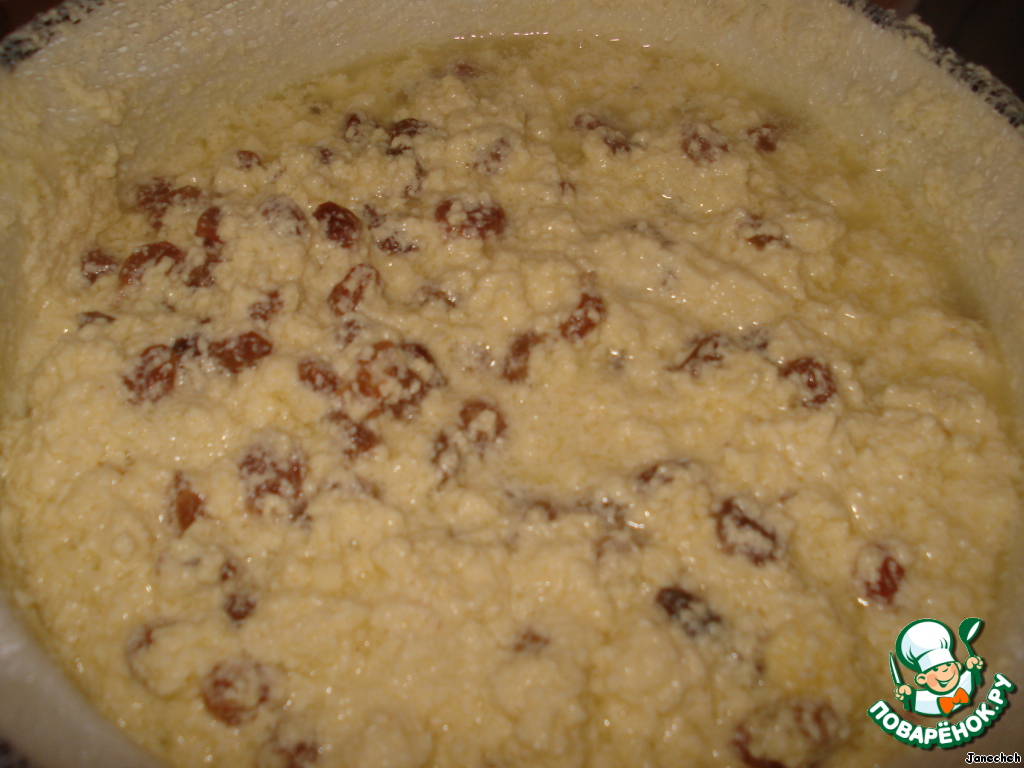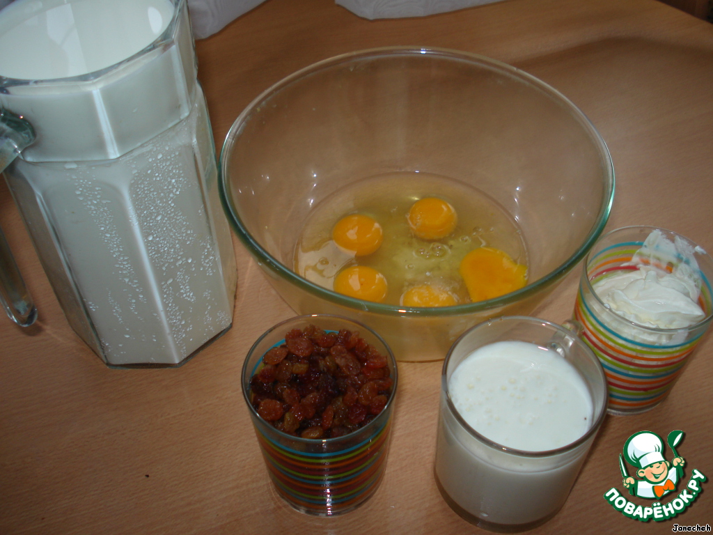 Кефир, яйца, сметану, соль размешать, влить молоко, добавить 1 стакан изюма и еще хорошо размешать, поставить на огонь.