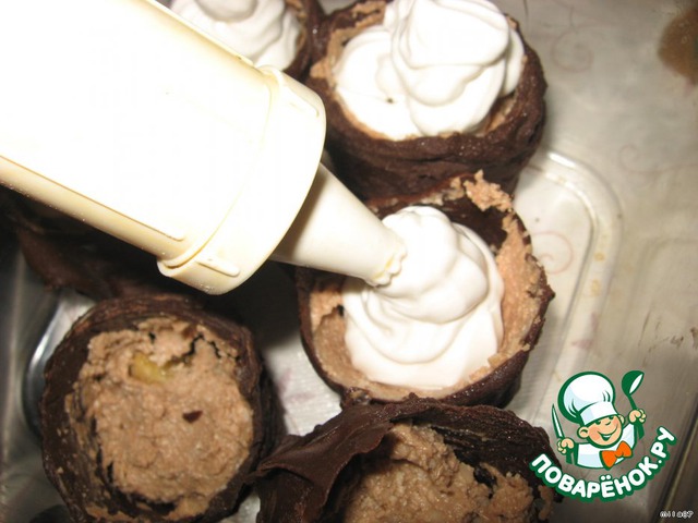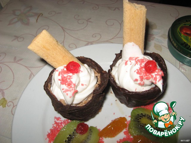| Шоколадные стаканчики, заполненные смесью из нежнейшего творожка с шоколадом "Баунти", с кусочками банана, украшенные взбитыми сливками, леденцами "Монпансье" и печеньем (вместо ложечки). Десерт, конечно, далеко не повседневный... просто мне удалось побаловать себя такой вкуснятинкой, т. к. получила в презент 2 (!) кг шоколада... и было любопытно заняться приготовлением стаканчиков из шоколада!!! |