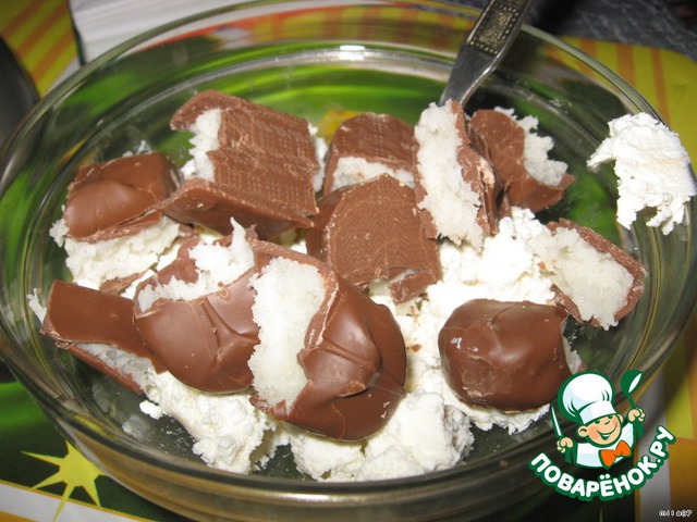 Творог перетираем через сито, шоколадку "Баунти" разламываем на кусочки и слека растапливаем на водяной бане или в микроволновке.