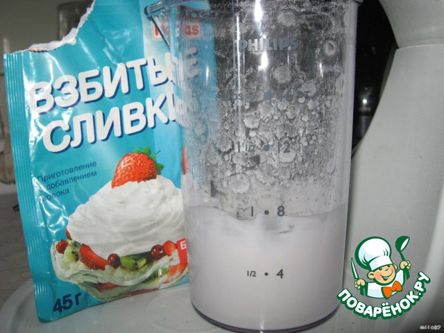 В емкости для взбивания перемешиваем молоко и сливки из пакетика, взбиваем, постепенно прибавляя скорость, до густоты.
