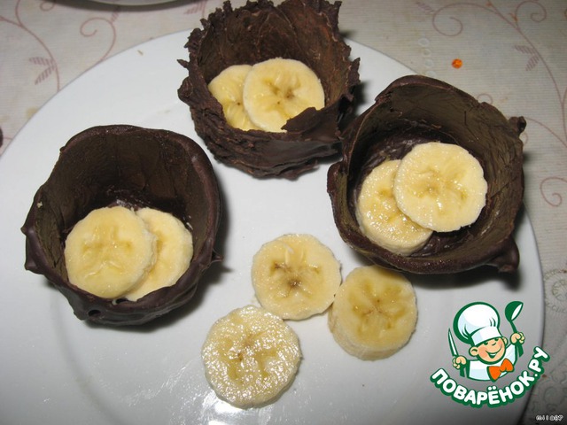 На дно каждого шоколадного стаканчика укладываем по 3-4 кружочка банана.