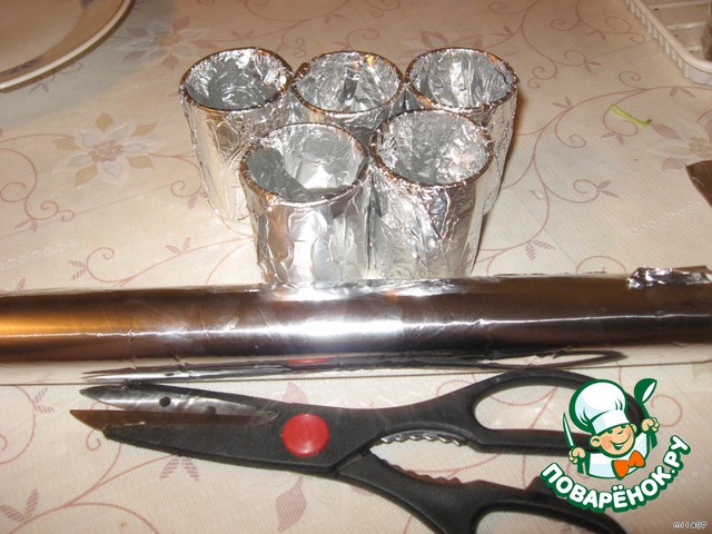 Целиндрообразные(!) небольшие стаканчики снаружи оборачиваем фольгой.