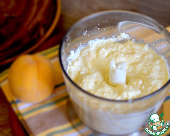 Соедините в чаше блендера творог, сахар и нарезанный персик.
