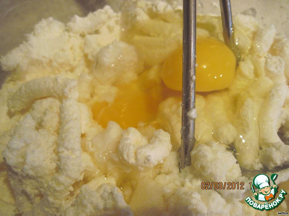 Творог растереть с сахаром, добавить яйца.