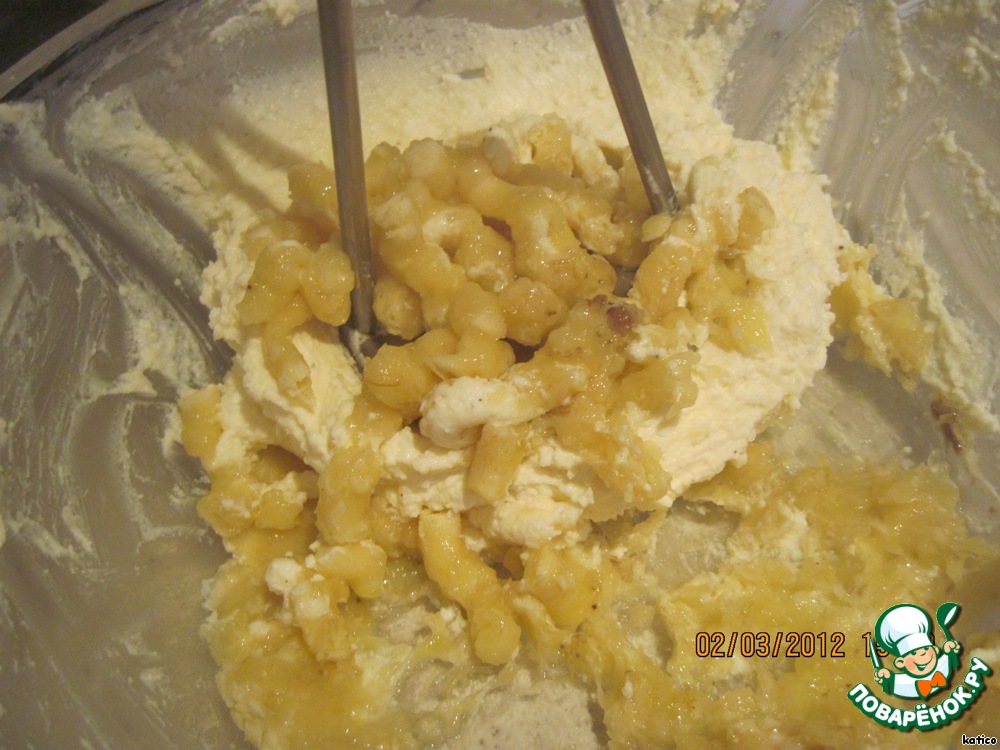 В оставшуюся 1/4 творога добавить 1 банан и размять все вместе до однородности.