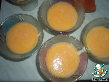 Теперь растворяем желатин по инструкции на упаковке, только воды берем 100 мл. После растворения добавляем желатин в творожное пюре и фруктовое (я добавила половину туда, половину туда).