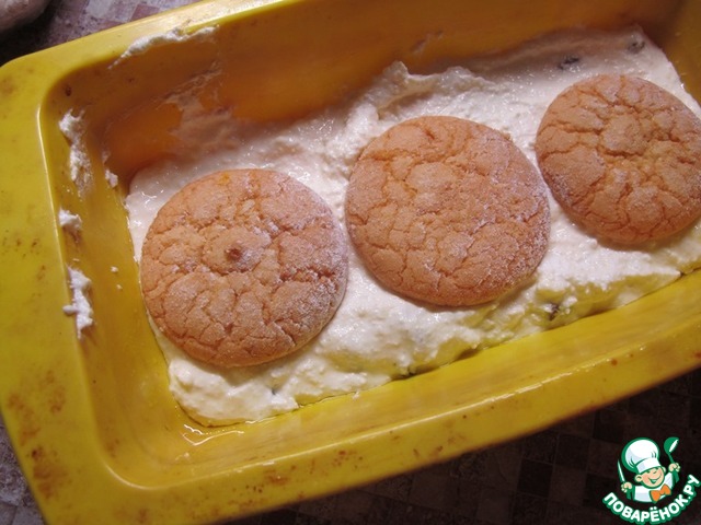 Возьмите силиконовую форму, смажьте ее растительным маслом и выложите в нее половину творожной массы. Печенье склейте с помощью джема и выложите поверх творожной массы в форму. Оставшиеся промежутки можно тоже заполнить джемом.