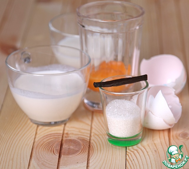 Влейте в кастрюлю молоко, сливки, добавьте столовую ложку сахара (предварительно отмерив 40г для крема) и ваниль (зерна из стручка, ванилин, эссенцию), и поставьте подогреваться.