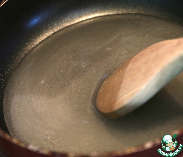 Для этого всыпаем сахар в сковороду, добавляем 3 ст. л. холодной воды, начинаем подогревать, помешивая, чтобы сахар растворится.