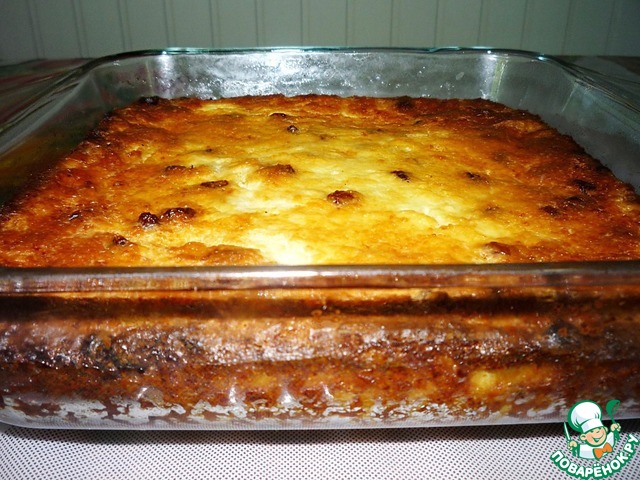 Молоко тёплое смешать с дрожжами и манкой. Яйца взбить с сахаром. Изюм промыть и обдать кипятком. Сметану тщательно перемешать с творогом. Все ингредиенты смешать до однородной массы. Выложить на смазанный топлёным сливочным маслом противень или форму, и отправить в духовку, предварительно разогретую до 170 градусов, на 50 минут.