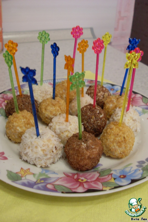 Мокрыми руками скатать шарики, вставить зубочистки или шпажки, или палочки для мороженого