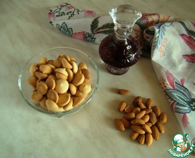 Подготовим недостающие продукты: печенье "Дамский пальчик", миндаль и ликер. У меня не оказалось апельсинового, потому я использовала вишневый. Но очень аккуратно, чтобы не испортить цвет десерта в бокале!!!