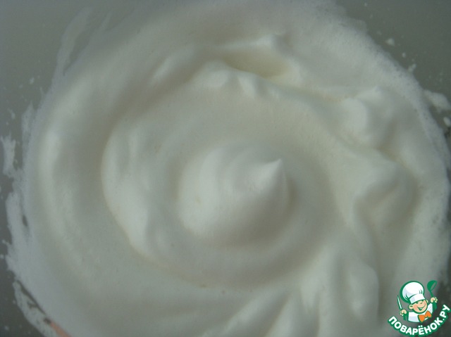Белки взбить с щепоткой соли до плотной пены.